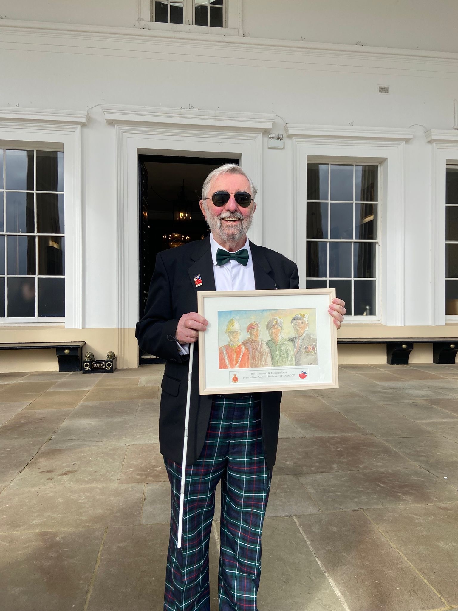 Blind veteran Bryan standing on the steps of Old College at RMA Sandhurst in formal attire with bow tie and dark glasses, holding up his line drawing of the same building with the actual classical columned facade visible behind him.