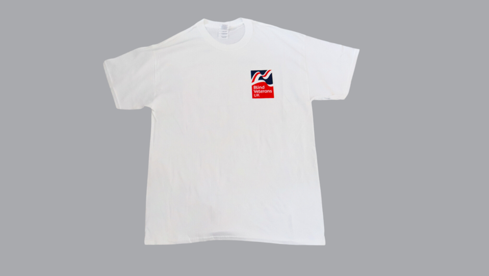 A white t-shirt featuring the Blind Veterans UK logo on the front left chest. Regular fit.